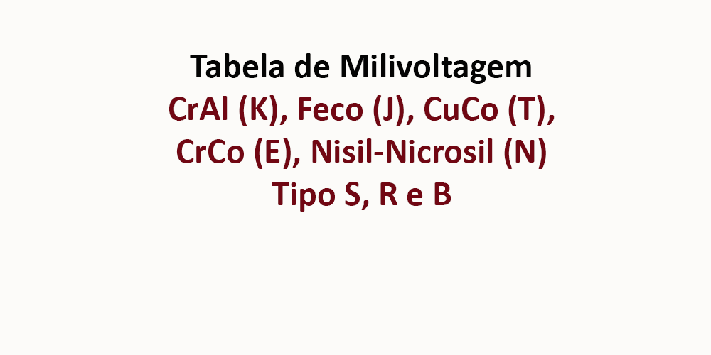 download Milivoltagem Download (mVolts x °C) Written by Portal Temperatura on 3 de julho de 2025 More in download Milivoltagem: Milivoltagem Termopar tipo B (PtRh30% PtRh6%) | °C x mVolts 4 de agosto de 2024 Milivoltagem Termopar tipo R (PtPtRh13%) | °C x mVolts 4 de agosto de 2024 Milivoltagem Termopar tipo S (PtPtRh10%) | °C x mVolts 4 de agosto de 2024 Download (mVolts x °C)