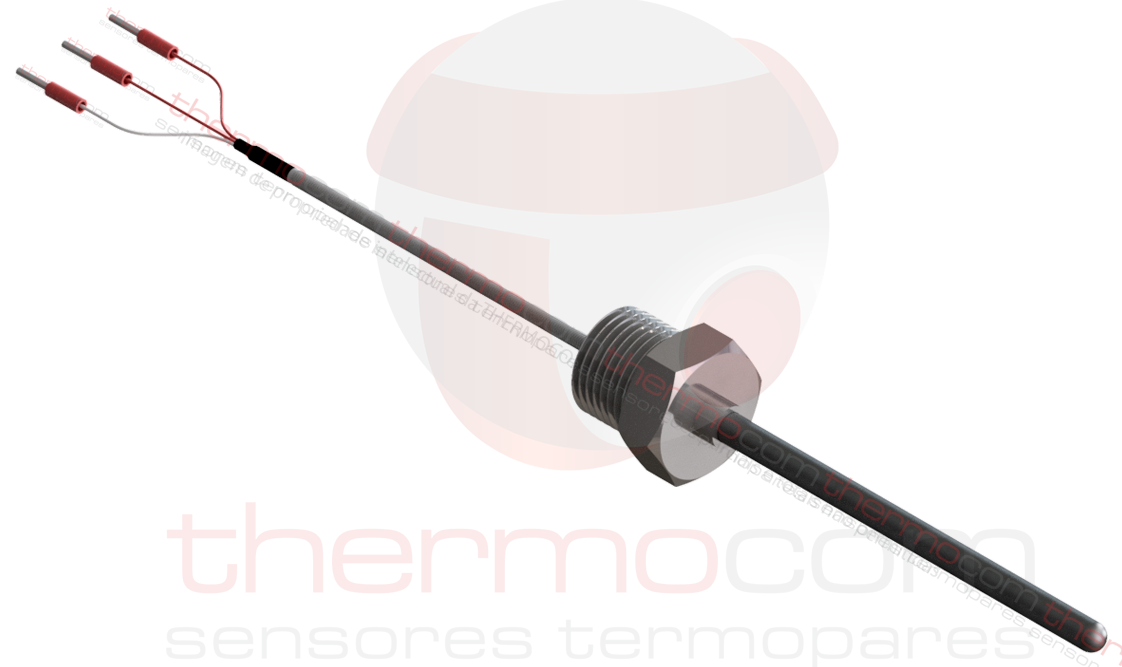 A termorresistência da série THCOM TR24 é produzda com haste de inox, rosca simples para conexão ao instrumento e cabos com terminais crimpados. Disponível bulbos Pt100, Pt1000, Ni120, Cu120, PTC, NTC e outros sob consulta. Montagem 2, 3 ou 4 fios.